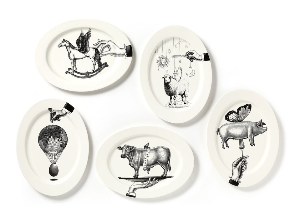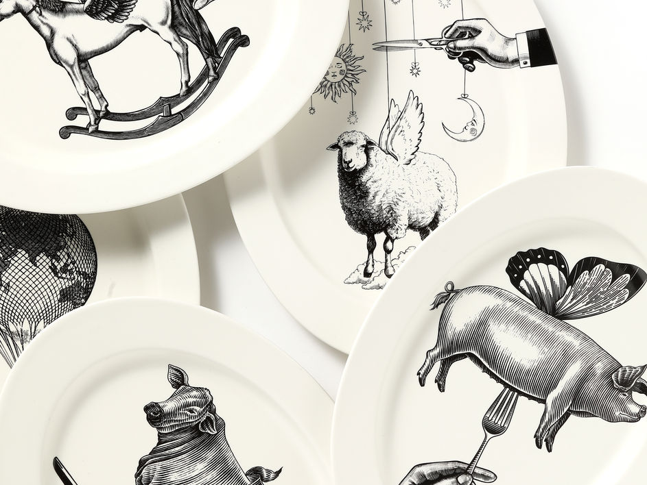 The Fables on the Table series reimagines familiar farm animals—chickens, pigs, sheep, and more—not as food, but as sentient beings with stories to tell. Through delicate pen-style drawings and whimsical table settings, the series gently invites reflection on our relationship with animals. Each piece serves not only as functional tableware, but also as a quiet advocate for plant-based living and compassion toward all creatures.
